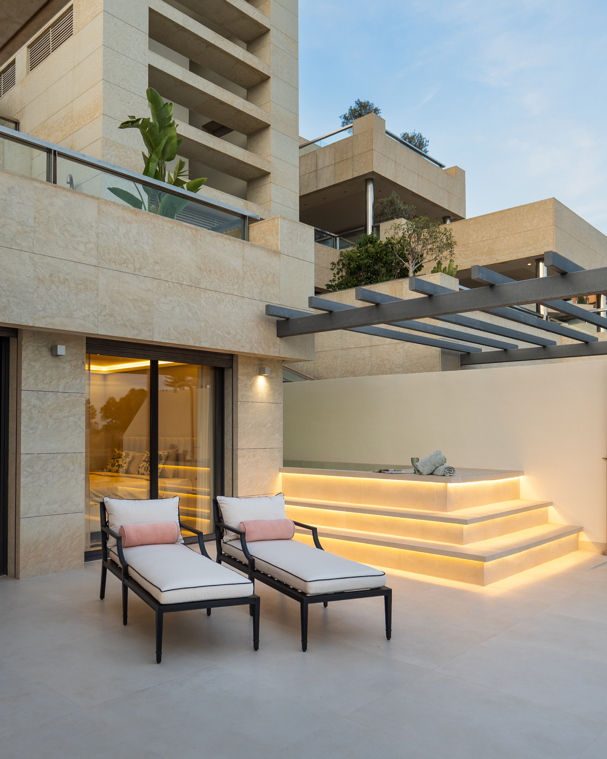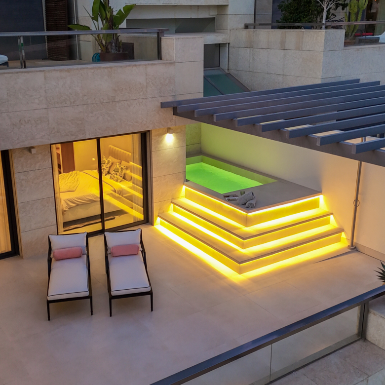 Het ruime terras van 155 m² is doordacht ontworpen met meerdere zones, waaronder een buitenkeuken met verlichting, dubbele gasbranders en voorbereiding voor een koelkast. Daarnaast is er een gezellige loungehoek en een dompelbad — perfect om te ontspannen of te genieten van gezellige momenten met uitzicht op de spectaculaire kustlijn.